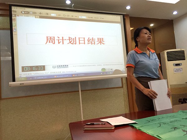 整個現(xiàn)場生機盎然,學習熱情高漲,在快樂中學習,在學習中成長。全員分三小組進行現(xiàn)場評比PK,獲得第一名小組(開拓組)總經(jīng)理李素芳給予獎勵500元,大家積極主動上臺分享學習成果。